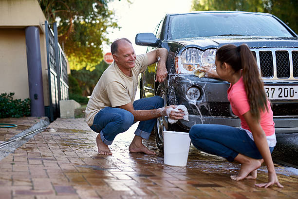 On the right side, the girl is wearing a pink shirt and she is also cleaning the car.